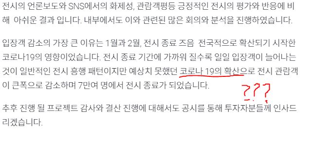 1. 2019.09.25~2020.02.09 미술전시시장의 최대 성수기. 겨울방학 포함된 극성수기. 안정적인 티켓매출 예상